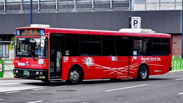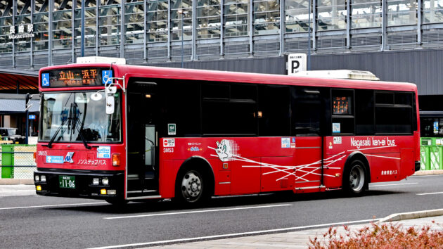 平成27(2015)年度除籍のJPのうち11輛が長崎県営バスへと移籍し、県営バスの中でも一大派閥となった。HRとは異なり、長与所属が大半を占める。HRと同じく行き先表示は窓も含め丁寧に中扉後に移設されており、車内モケットも張り替えられている。3M54、4M52のみナンバープレートの枠の加工が他と異なっているのが特徴。