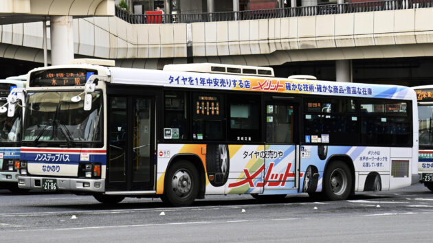茨城交通/いすゞ/KL-LV280L1改 [motolist company=IBAKOU kata=KL-LV280L1] 令和元(2019)年秋に茨城交通に16年ぶりに登場した元都営バス。いすゞのK代大型で、1輛のみ在籍する。みんくるモケットはそのままで、都営時代の痕跡を残している。 令和3(2021)年7月頃より「タイヤのメリット」のラッピング広告車になった。 令和7(2025)年春頃に引退。 K487水戸200か2106 (H07C) (よっちー) (緑★)