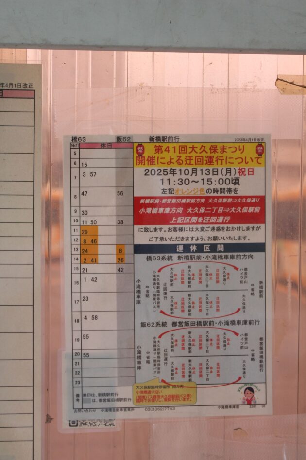 令和7(2025)年10月13日(月・祝)、大久保まつりの開催により大久保通り(大久保駅~大久保通り停留所)が通行止めとなるため、[飯62][橋63](小滝橋車庫~都営飯田橋駅・新橋駅)は11:30~15:00の間、該当区間で迂回を行う。小滝橋・職安・明治通り経由に迂回となり、途中の代替停留所はない。なお、大久保駅の停留所は関東バスの小滝橋通り上の停留所に移設となる。