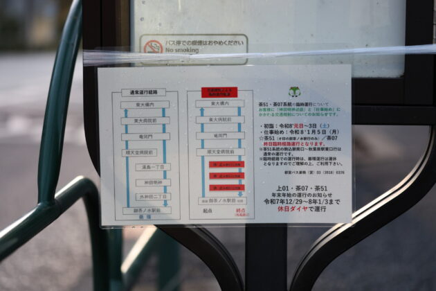 • [茶51]…早朝の御茶ノ水駅止まりは本郷三丁目→御茶ノ水駅を順天堂病院経由に迂回。湯島一丁目・神田明神・外神田二丁目には停車せず