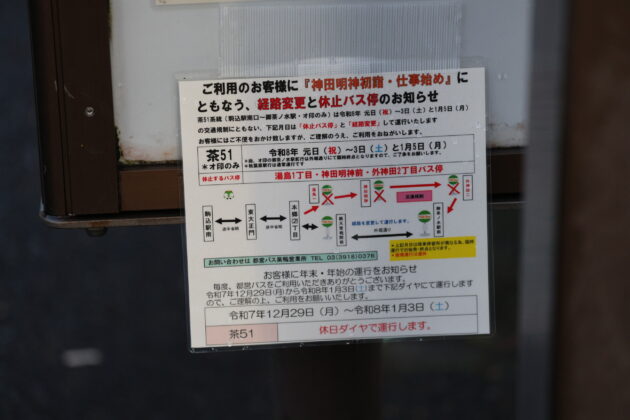 また、神田明神周辺で初詣の人出に伴い表参道が通行止めとなるため、[茶07][茶51]は神田明神を通らない迂回となる。詳細は以下の通り。