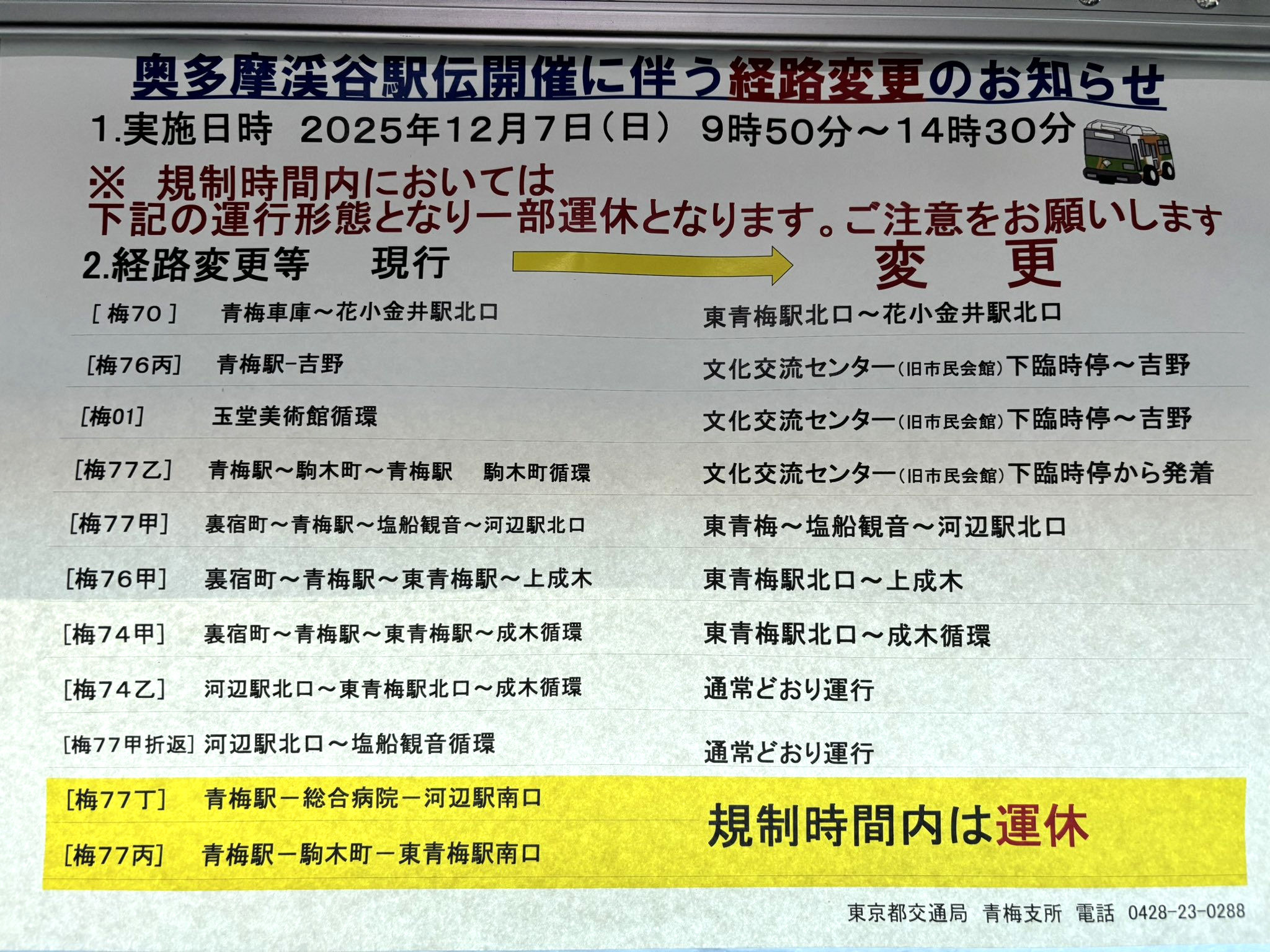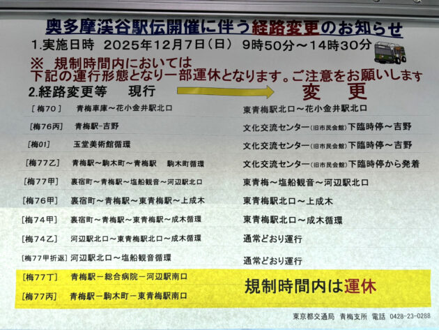 令和7(2025)年12月8日、奥多摩渓谷駅伝競走大会による青梅市内の都バスの各系統で迂回が行われた。青梅駅前が通行止めとなるため、9:30~14:30頃の間、万年橋・吉野・駒木町方面は青梅駅南西の文化交流センター下(臨時)から、成木・花小金井方面は東青梅駅北口から、塩船観音方面は東青梅から始発運転となった。詳細は以下の通り。