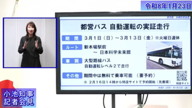 東京都交通局は令和8(2026)年3月1日より13日まで自動運転バスの実証実験を行うことを小池都知事が1月23日の定例記者会見にて発表した。