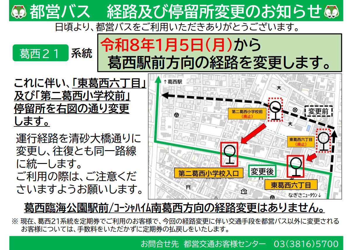 令和8(2026)年1月5日より、[葛西21](葛西駅~葛西臨海公園駅)のうち、葛西駅方面の東葛西六丁目・第二葛西小学校入口を清砂大橋通りに移設し、上下で経路を統一する。