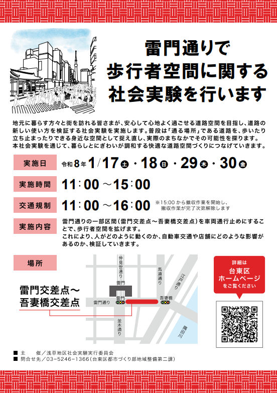 これは台東区が実施する社会実験で、雷門前~吾妻橋西詰を歩行者専用空間として開放し、「普段は「通る場所」である道路を、歩いたり立ち止まったりできる身近な空間として捉え直し、実際のまちなかでその可能性を探ります」とのこと。普段では見られない平日の規制が珍しい。いずれも11時~15時の昼間の時間帯のみとなっている。