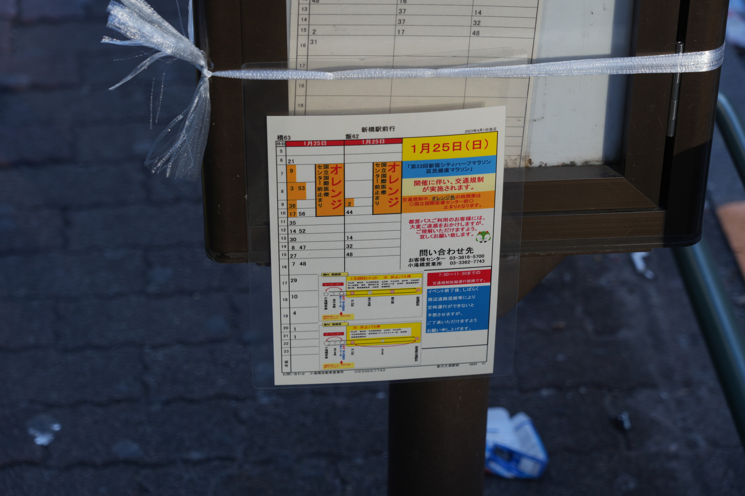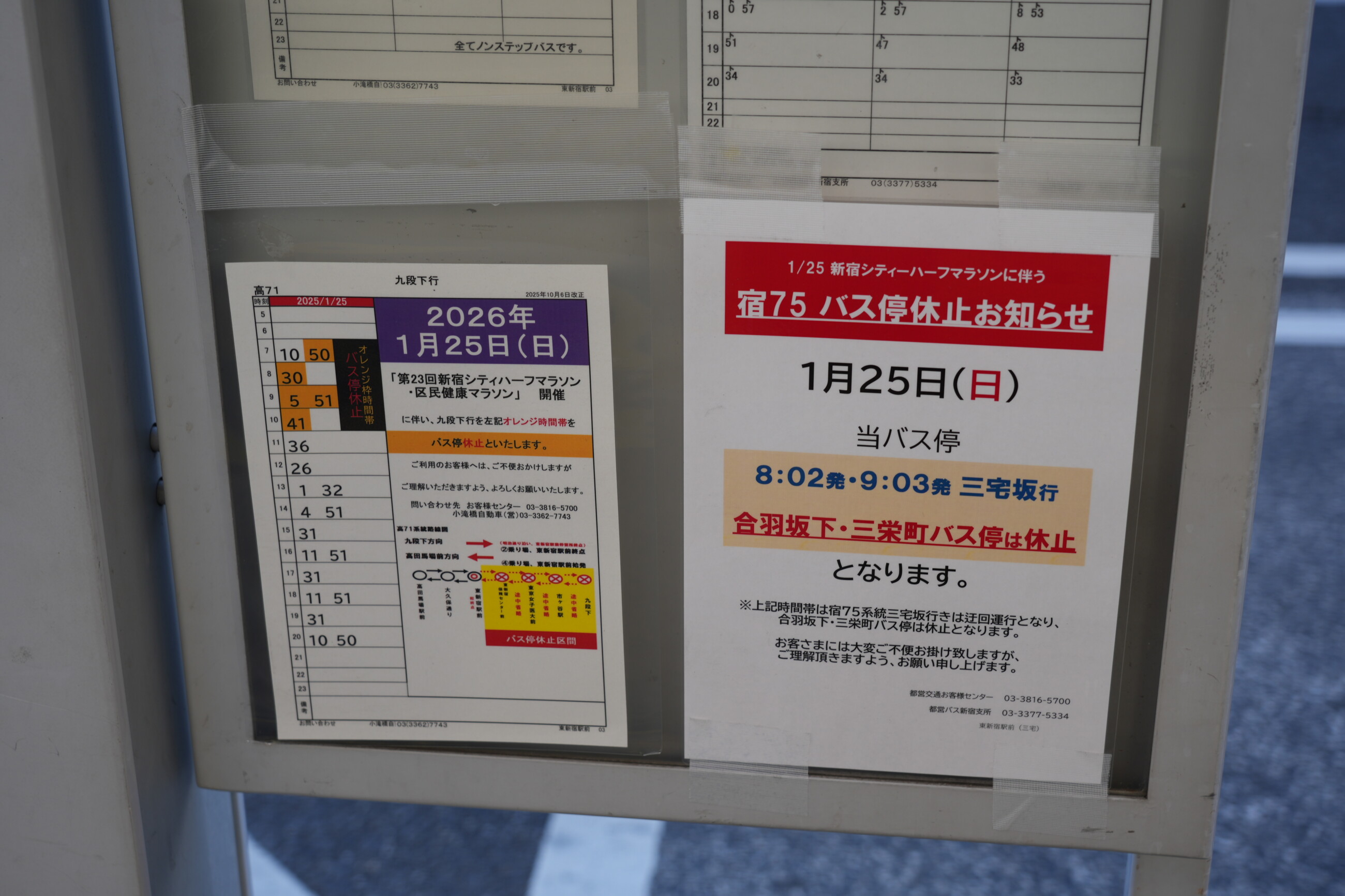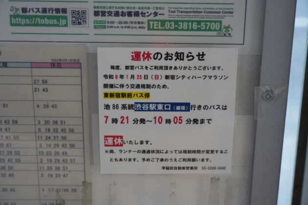 令和8(2026)年1月25日に第23回新宿シティハーフマラソンが開催されることに伴い、国立競技場付近の外苑東通り・外苑西通りがコースとして使われて交通規制が敷かれるため、規制区間を通る関係系統は迂回・途中止まりの運転となった。規制は昨年同様となっている。
