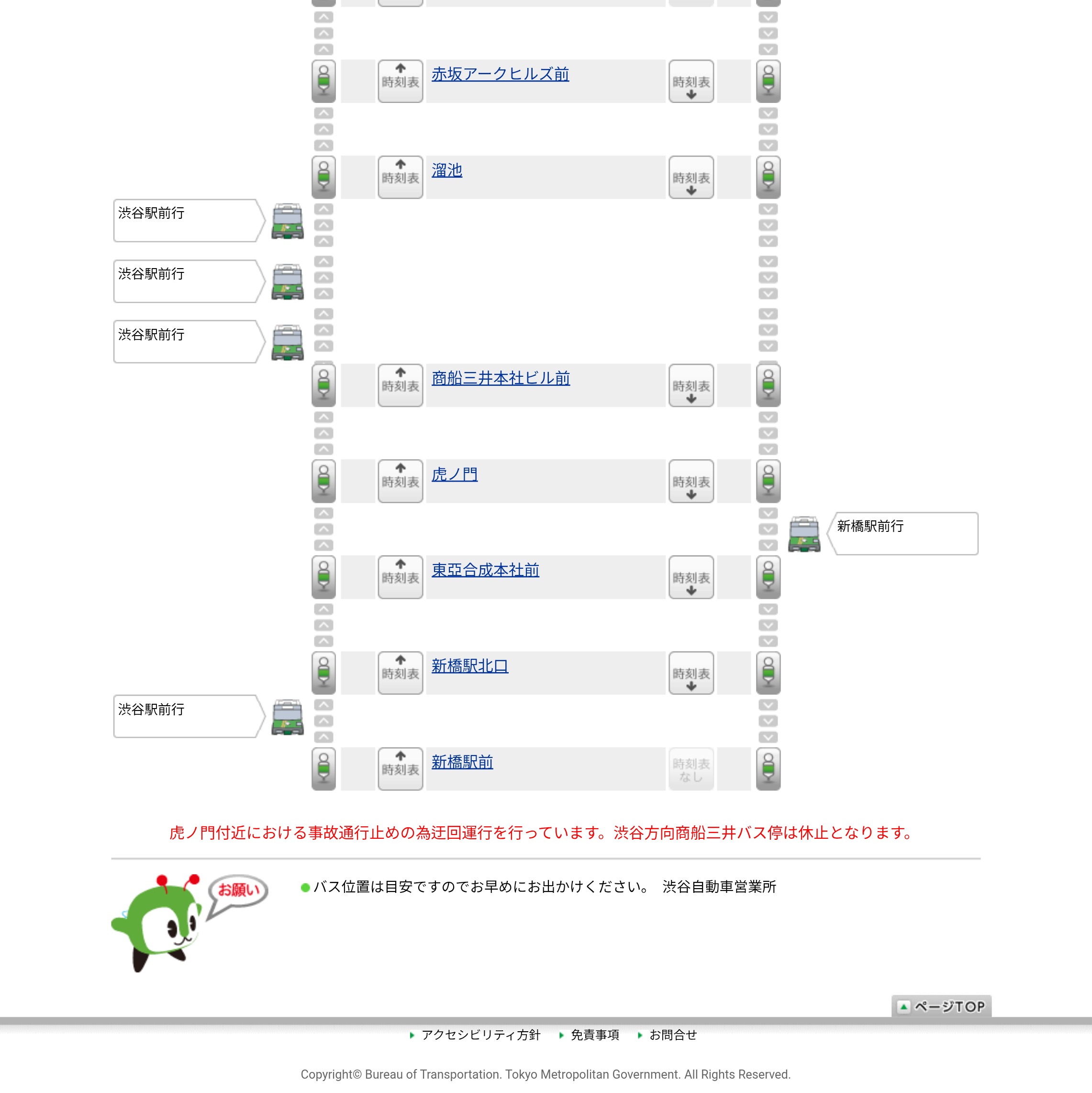 1/22、特許庁多重事故により[都01]迂回 令和8(2026)年1月22日の18:30過ぎ、内閣府の公用車が暴走して外堀通りの特許庁交差点で多数の車を巻き込む事故が起こった。このため外堀通りが長らく通行止めとなり、[都01](渋谷駅~新橋駅)は渋谷駅方面のみ虎ノ門→溜池を国会方面に迂回し、商船三井ビル(霞が関三丁目)バス停は終バスまで休止となった。 tobus.jpでの告知