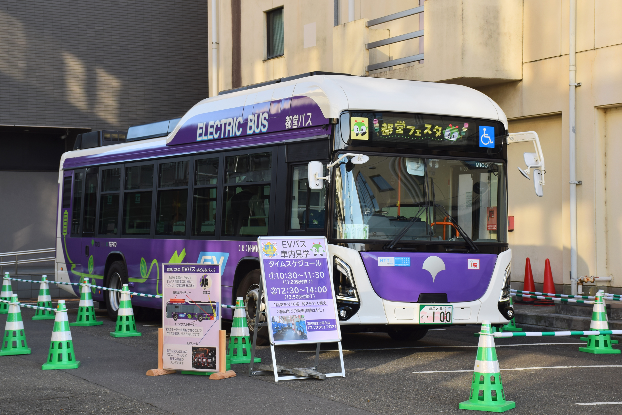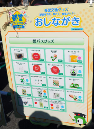 都営バス部門は物販は都営バス・みんくるグッズのみ。部品販売は事前抽選だったが都営地下鉄のみとなって自動車工場のみんくるモケットグッズも特になかった。物販コーナーは都営地下鉄と合同コーナーになっており、長蛇の列となっていた。これとは別に、都営バス車両が展示されており、今年は北から電気バスのM100が展示つれた。運転席に座って体験コーナーが開催され、長い列になっていた。