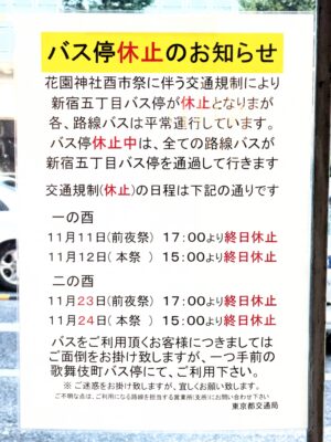 令和7(2025)年11月12日・24の酉の日に関連して、花園神社の大酉祭で付近の歩道も含めて大変な人出となるため、以下の停留所は休止となる。停留所によって規制時刻が異なるので注意のこと。また、前夜祭(酉の日の前日)も対象となる。