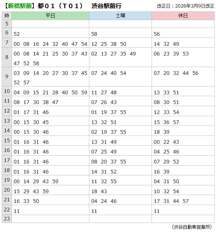 それ以外の系統は大きな変化がない。また、[都01]は終バスもさらに繰り上げられ、渋谷駅発は平日22:20発の溜池止がなくなり22:11発の赤坂アークヒルズ止に変更、土曜も22:10発の溜池止から21:56発の赤坂アークヒルズ止に、休日は新橋駅行で変わらないものの21:50→21:41発に繰り上げとなる。