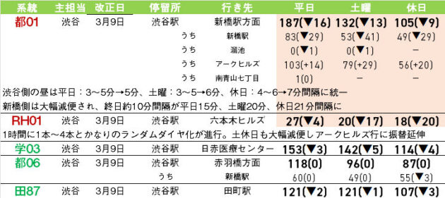 3/9、渋谷管内でダイヤ改正。[都01]新橋側大幅減便