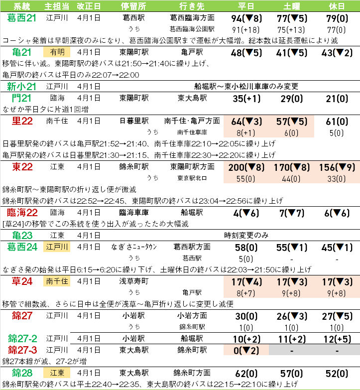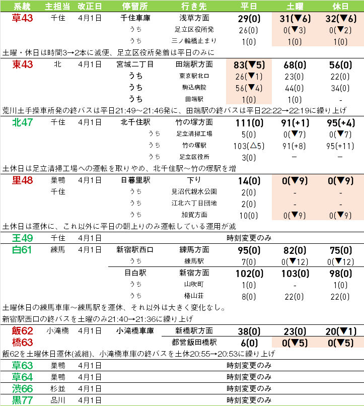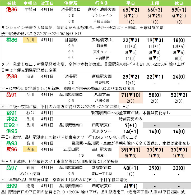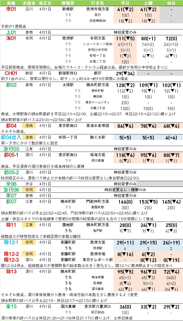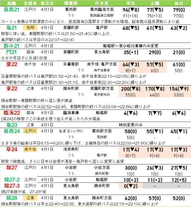 ただし、直営への移管や一部区間の減便で回送距離が減り、組数が減っても主要区間の本数が維持されるケースもあり、なるべく大きく利便性を落とさないように設定されているが、系統によっては減便幅が大きいものも。[CH01](新宿駅西口~都庁循環)は平日朝夕のみとなり、朝は3台使用・4分間隔程度だったのが1台使用・15分間隔程度と大きく減少する。また、[葛西21]はダイヤ構成が変わり、早朝深夜以外は全便葛西臨海公園駅発着となり利便性がアップする。[臨海22](船堀駅~臨海車庫)・[田99出入](品川駅港南口~港南四丁目)は出入系統のため、出入として使う運用が減り大幅減便。